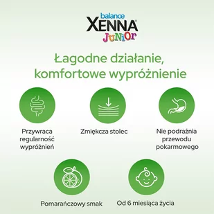 Xenna Balance Junior wyrób medyczny o działaniu przeczyszczającym w przypadku przewlekłych zaparć i w sporadycznych przypadkach nieregularnej pracy jelit. Polecany do stosowania dla dzieci od 6. miesiąca życia.