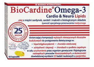 BioCardine®Omega-3 Cardio & Neuro Lipids – wsparcie dla serca, mózgu i układu nerwowegoCzym jest produkt?BioCardine®Omega-3 Cardio & Neuro Lipids to żywność specjalnego przeznaczenia medycznego, zawierająca naturalny olej z mięśni sardynek, sardeli i makreli, bogaty w niezbędne nienasycone kwasy tłuszczowe. Unikalny skład wspiera procesy kluczowe dla zdrowia serca, mózgu, układu nerwowego i odporności. Skuteczność potwierdzona w 25 badaniach naukowych. Kiedy stosować?Preparat przeznaczony jest do