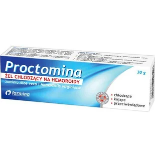 Skład: Aqua Purificata, Hamamelis Virginiana Extract, Aloe Vera Gel, Propylene Glycol, Polidocanol, Hydroxyethylocellulose, Phenoxyethanol.Wskazania: żel chłodzący wskazany do stosowania zewnętrznego, w celu łagodzenia podrażnień i objawów towarzyszących hemoroidom oraz innym dolegliwościom okolic odbytu takich jak ból, świąd, pieczenie i podrażnienia.Sposób użycia: delikatnie nanieść warstwę preparatu na oczyszczoną i suchą okolicę odbytu. Stosować 2-3 razy dziennie, zwłaszcza rano i wieczorem lub częściej w razie potrzeby. W celu zmniejszenia podrażnienia wywołanego tarciem, preparat nałożyć przed wypróżnieniem pamiętając, aby po wypróżnieniu również zastosować żel PROCTOMINA. Zaleca się umycie rąk po każdym zastosowaniu PROCTOMINA żel.Przeciwwskazania: Nie stosować w przypadku nadwrażliwości na którykolwiek składnik produktu.