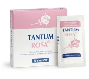 Tantum Rosa (saszetki) to lek stosowany w leczeniu objawów infekcji i podrażnień intymnych, do przemywania w czasie połogu oraz w profilaktyce przed i pooperacyjnej w ginekologii. Leczy dolegliwości i objawy (ból, świąd, pieczenie, upławy, obrzęk) okolic intymnych i pochwy.
