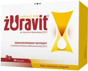 Żuravit zawiera wysoko skoncentrowany ekstrakt z żurawiny wielkoowocowej (25:1) standaryzowany na zawartość proantocyjanidyn (PAC). Owoce żurawiny zapobiegają infekcjom dróg moczowych. Związki w nich zawarte powodują, że do ścian pęcherza i cewki moczowej nie przywierają bakterie Escherichia coli. Cytryniany, które zawiera żurawina ograniczają tworzenie się złogów wapniowych w nerkach, a te, które już istnieją pomagają rozpuszczać. Zastosowanie: uzupełnienie diety w składniki wspomagające prawidłowe funkcjonowanie dróg moczowych. Zalecane spożycie: stosować 1 kapsułkę 3 razy dziennie przez pierwsze trzy dni, a następnie 1 kapsułkę 1 raz dziennie. Składniki: oleje roślinne (kokosowy, palmowy), ekstrakt z żurawiny wielkoowocowej (26,2%), żelatyna wieprzowa, stabilizator - gliceryna, emulgator - lecytyna sojowa, przeciwutleniacz - kwas askorbinowy, nośnik - dwutlenek krzemu koloidalny, barwniki: dwutlenek tytanu, tlenek żelaza czerwony. 1 kapsułka zawiera: 220mg mocno skoncentrowanego ekstraktu żurawiny wieloowocowej (25:1), co odpowiada 5500mg owocu żurawiny. Przeciwwskazania: uczulenie na soję lub którykolwiek ze składników produktu. Ważne wskazówki: Nie należy przekraczać dziennej zalecanej porcji do spożycia. Zrównoważona i zróżnicowana dieta oraz zdrowy styl życia są podstawą zapewnienia prawidłowego funkcjonowania organizmu. Suplement diety nie może być stosowany jako substytut (zamiennik) zróżnicowanej diety. Przechowywać w oryginalnym opakowani, w temperaturze poniżej 25°C, w sposób niedostępny dla małych dzieci. Chronić przed światłem i wilgocią. Producent: Herbapol-Lublin S.A. ul.