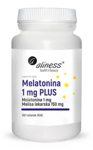 OPIS Melatonina 1mg Plus melisa lekarska 150 mg 100 tabletek Aliness - pomaga w regulowaniu snu- działa odprężająco- pomaga w zasypianiu Najlepiej znanym działaniem melatoniny jest regulacja rytmów biologicznych. Melatonina wpływa na zegar biologiczny - m. in. reguluje cykl snu i czuwania. Jednak jest ona nie tylko strażnikiem naszego rytmu biologicznego. Działa także immunomodulująco, czyli reguluje odpowiedź układu immunologicznego.