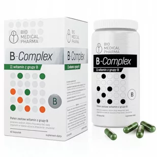 Najważniejsze właściwości Bio Medical Pharma B-complex 60 kapsułek: zawiera cholinę, kwas pantotenowy, niacynę, tiaminę, inozytol, PABA, ryboflawinę, pirydoksynę, kobalaminę, kwas foliowy, biotynę tiamina niezbędna jest do prawidłowej czynności serca [ID 20] kwas pantotenowy redukuje zmęczenie [ID 63] Kobalamina odpowiada za tworzenie erytrocytów [ID 92] wygodna forma kapsułki Skład: Składnik - 1 kapsułka (%RWS) Cholina - 50 mg (-) Kwas pantotenowy - 100 mg (1667) Niacyna - 80 mg (500) Tiamina - 50 mg (4545) Inozytol - 50 mg (-) Kwas para-aminobenzoesowy (PABA) - 50 mg (-) Ryboflawin - 40 mg (2857) Witamina B6 - 18 mg (1286) Witamina B12 - 100 µg (4000) Kwas foliowy - 500 µg (250) Biotyna - 500 µg (1000) Dwuwinian choliny (cholina); hydroksypropylometyloceluloza; D-pantotenian wapnia (kwas pantotenowy); amid kwasu nikotynowego (niacyna); monoazotan tiaminy (tiamina); substancja wypełniająca: celuloza; inozytol; kwas para-aminobenzoesowy (PABA); ryboflawina; pirydoksalo-5-fosforan (witamina B6); metylokobalamina (witamina B12); substancje przeciwzbrylające: sole magnezowe kwasów tłuszczowych, dwutlenek krzemu; L-metylofolian wapnia Extrafolate-S® (kwas foliowy); D-biotyna (biotyna); barwnik: