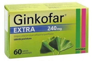 Wskazania: w celu poprawy zdolności poznawczych u osób starszych (osłabienie pamięci i sprawności umysłowej związane z wiekiem); w celu poprawy jakości życia w łagodnej demencji. Produkt jest wskazany do stosowania u osób dorosłych. Skład: 240mg Ginkgonis extractum siccum raffinatum et quantificatum - kwantyfikowanego suchego wyciągu z Ginkgo biloba L., folium (liść miłorzębu) (35 - 67 : 1), co odpowiada: 52,8 do 64,8 mg flawonoidów w przeliczeniu na glikozydy flawonowe, 6,72 do 8,16 mg ginkgolidów A, B i C, 6,24 do 7,68 mg bilobalidu. Rozpuszczalnik używany do pierwszej ekstrakcji: aceton 65% v/v. Substancje pomocnicze: celuloza mikrokrystaliczna, krospowidon, laktoza jednowodna, talk, magnezu stearynian, kroskarmeloza sodowa, krzemionka koloidalna bezwodna, alkohol poliwinylowy, tytanu dwutlenek (E171), makrogol 3000, tlenek żelaza żółty (E172), talk. Działanie: kwantyfikowany wyciąg z liści miłorzębu japońskiego poprawia przepływ krwi w mózgu, rozszerza naczynia krwionośne i zapobiega agregacji płytek. Dawkowanie: 1 tabletkę na dobę. Leczenie powinno trwać co najmniej 8 tygodni. Jeżeli po 3 miesiącach stosowania preparatu nie następuje poprawa lub jeżeli nastąpiło pogorszenie objawów, należy zwrócić się do lekarza w celu ustalenia czy kontynuacja leczenia jest uzasadniona. Produkt leczniczy Ginkofar Extra przyjmuje się doustnie. Tabletki należy połknąć, popijając wodą. Można je przyjmować niezależnie od posiłków. Przeciwwskazania: produktu leczniczego Ginkofar Extra nie należy stosować u dzieci i młodzieży, w ciąży oraz w przypadku złej tolerancji i nadwrażliwości na którykolwiek z jego składników; zwiększona skłonność do krwawień (skaza krwotoczna). Osoby przyjmujące leki przeciwzakrzepowe lub przeciwpłytkowe (tzw. leki rozrzedzające krew), powinny skontaktować się z lekarzem przed zastosowaniem tego leku. Przed zabiegiem operacyjnym należy poinformować lekarza lub stomatologa o stosowaniu leku. Zaleca się przerwać stosowanie leku przynajmniej 3-4 dni przed planowanym zabiegiem chirurgicznym lub stomatologicznym, np. wyrwanie zęba. Należy zachować ostrożność u pacjentów z padaczką. Odradza się przyjmowania leku razem z alkoholem.