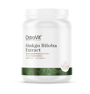 OstroVit Ekstrakt z Miłorzębu Japońskiego 50 g OstroVit Ekstrakt z Miłorzębu Japońskiego zawiera w sobie ekstrakt z liści miłorzębu japońskiego (Ginkgo Biloba L.), który wykazuje właściwości poprawiające zdolności kognitywne oraz powstrzymania ich naturalnego pogarszania wraz z wiekiem oraz jako substancja wspierająca pamięć. Ginkgo Biloba Miłorząb japoński to długowieczny gatunek drzewa, które może rosnąć nawet przez 4000 lat i wbrew swojej nazwie wcale nie pochodzi z Japonii, a z Chin. Wykorzystywanie liści Ginkgo biloba ma wieloletnią tradycję i jest związane przede wszystkim z doświadczeniami tradycyjnej medycyny dalekiego wschodu. To właśnie z liści tej rośliny pozyskuje się najważniejsze składniki aktywne, którymi są ginkoflawonoglikozydy oraz laktony terpenowe odpowiedzialne za korzystne działanie rośliny na organizm człowieka. Ginkgo biloba wykazuje również działanie zwiększające przepływ krwi w układzie sercowo-naczyniowym.