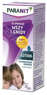 Paranit Lotion skutecznie i szybko eliminuje wszy i gnidy. Podwójna formuła działania preparatu sprawia, iż zabija oraz wysusza wszy i gnidy. Badania kliniczne potwierdzają skuteczność preparatu. Ponieważ nie zawiera środków owadobójczych - nie jest możliwy rozwój oporności pasożytów na preparat. Odpowiedni dla dzieci od 2 roku życia, skuteczny w 15 min. Zastosowanie: wszawica. Sposób użycia: przed użyciem należy wstrząsnąć butelką. Odpowiednią ilość lotionu Paranit nałożyć bezpośrednio na suche włosy. Lotion Paranit równomiernie rozprowadzić na suchych włosach, od nasady aż po końcówki. Preparat należy nałożyć na całe włosy i skórę głowy. Następnie wmasować go dokładnie, zwracając szczególną uwagę na kark i skórę za uszami. Wmasowany preparat należy pozostawić na 15 minut. Preparat odpowiedni dla dzieci od 2 roku życia. Składniki: olej mineralny i dimetikon oraz substancje pomocnicze. Ważne wskazówki: Bez zapachu. Bez środków owadobójczych. Przeznaczony dla dorosłych i dzieci od 6 miesiąca życia. Nie należy stosować u osób z nadwrażliwością na jakikolwiek składnik preparatu. Przechowywać w temperaturze pokojowej, w miejscu niedostępnym dla dzieci. Możliwe działania niepożądane (swędzenie i podrażnienie okolic oczu, łuszczenie skóry głowy, zaczerwienienie skóry głowy, uszu i karku). Dystrybutor: Omega Pharma Poland Sp.zo.o. ul.
