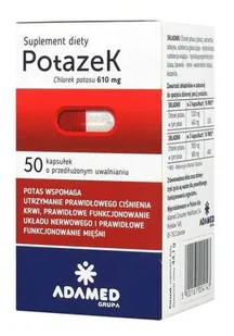 Suplement diety Potazek przeznaczony jest do stosowania jako preparat ułatwiający pokrycie zapotrzebowania organizmu na potas. Potazek suplement diety polecany jest w szczególności dla osób dbających o prawidłowe ciśnienie krwi. Zrównoważona dieta oraz zdrowy tryb życia są ważne dla prawidłowego funkcjonowania organizmu. Preparat wspomaga prawidłowe funkcjonowanie układu nerwowego, prawidłowe funkcjonowanie mięśni, utrzymanie prawidłowego ciśnienia krwi. Zastosowanie: przeznaczony jest do stosowania jako preparat ułatwiający pokrycie zapotrzebowania organizmu na potas. Potazek suplement diety polecany jest w szczególności dla osób dbających o prawidłowe ciśnienie krwi. Zalecane spożycie: 1 kapsułka 2-3 razy dziennie. Preparat przyjmować w czasie posiłku lub tuż po nim popijając wodą. Składniki: potas (chlorek potasu), sacharoza, żelatyna - składnik kapsułki, etyloceluloza - substancja wiążąca, substancja wiążąca - hydroksypropylometyloceluloza, tlenki żelaza E172 - barwnik, koszenila E120 - barwnik 2 kapsułki zawierają: potas 640mg (chlorek potasu 1220mg) (32%)*. *RWS- Referencyjna Wartość Spożycia. Przeciwwskazania: nie stosować w przypadku uczulenia na którykolwiek ze składników produktu. Produkt niewskazany dla kobiet w ciąży i karmiących piersią. Ważne wskazówki: Nie należy przekraczać zalecanej dziennej porcji. Zrównoważony sposób żywienia i prawidłowy tryb życia jest ważny dla funkcjonowania organizmu człowieka. Suplement diety nie może być stosowany jak substytut(zamiennik) zróżnicowanej diety. Suplementy diety powinny być przechowywane w sposób niedostępny dla małych dzieci, w temperaturze pokojowej i w suchym miejscu. Zawiera cukier. Wyprodukowano w Polsce dla: ADAMED CONSUMER HEALTHCARE S.A.