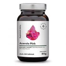 OPISAcerola Pink ekstrakt z owoców aceroli ok. 320 tabletek 80g Aura Herbals -wzmocnienie odporności-silny antyoksydant-wspomaga układ nerwowy-zmniejsza uczucie zmęczenia Ekstrakt z owoców aceroli (Malpighia Glabra). Standaryzowany na zawartość 25% witaminy C. Jest to najlepsze naturalne źródło witaminy C. Witamina C wspomaga organizm w prawidłowym funkcjonowaniu układu odpornościowego, chroni komórki przed stresem oksydacyjnym.