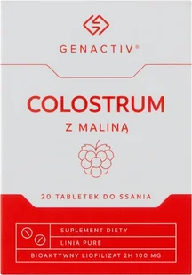 Genactiv Colostrum z Maliną 60 Tabletek Do SsaniaGenactiv Colostrum z Malinąto wartościowe uzupełnienie diety dla osób, które chcą zachować zdrowie swojego organizmu. Produkt stworzony jest na bazie colostrum bovinum - wyjątkowej i niezwykle skutecznej substancji naturalnej. Starannie opracowana i opatentowana procedura pozyskiwania surowca oraz zaawansowana technologia procesu liofilizacji sprawia, że otrzymane colostrum zachowuje swoje naturalne właściwości oraz jest bogate w witaminy i miner