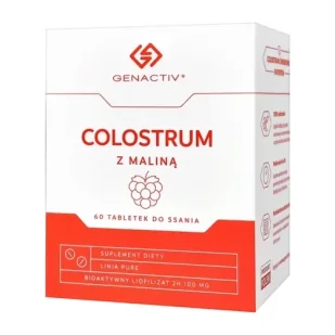 Suplement diety COLOSTRUM Z MALINĄ GENACTIV 60 tabletek to wartościowe uzupełnienie diety dla osób, które chcą zachować zdrowie swojego organizmu. Colostrum bovinum firmy Genactiv jest pozyskiwane w ciągu pierwszych dwóch godzin od rozpoczęcia laktacji, dzięki czemu stężenie czynników aktywnych jest najwyższe. Dzięki specjalnej procedurze pozyskiwania surowca oraz dzięki liofilizacji - zaawansowanej technologii, osiągnięto produkt o jakości odpowiadającej produktowi świeżemu. Liofilizacja jako jedyna technologia pozwala na zachowanie pełnej bioaktywności wszystkich składników zawartych w colostrum.