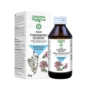 Wskazania:Kaszel z trudnością w odkrztuszaniu lepkiej wydzieliny.Działanie: wykrztuśne - rozrzedza śluz, ułatwia odkrztuszanie.Dawkowanie:- dorośli i młodzież powyżej 12 roku z życia doustnie 3 razy dziennie 10ml (łyżka stołowa),- dzieci w wieku 6-12 lat doustnie 3 razy dziennie 5ml (łyżeczka).W czasie kuracji stosować duża ilość płynów, aby umożliwić wywołanie prawidłowego odruchu wykrztuśnego i nie spowodować podrażnienia układu oddechowego.Skład: 100g syropu zawiera: substancje czynne: płynny wyciąg z ziela tymianku (1:3) (Thymi extractum fluidum) 15,0g, tymol (Thymolum) 0,01g; substancje pomocnicze: syrop prosty (sacharoza i woda oczyszczona), wodorotlenek amonowy, etanol.Lek zawiera około 4,5% (v/v) etanolu.Przeciwwskazania:Nadwrażliwość na którykolwiek składnik syropu.