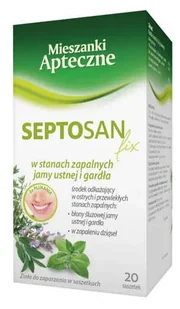 do płukania (jako napar) WIELKOŚĆ OPAKOWANIA: 20 saszetek SKŁAD: 1 saszetka 2,0 g zawiera: Ziele tymianku (Thymi herba) 1,0 g; Liść szałwii (Salviae folium) 0,5 g; Liść mięty pieprzowej (Menthae pip. folium) 0,5 g. ZASTOSOWANIE: