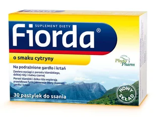 Fiorda o smaku cytryny to wyjątkowo bezpieczny i skuteczny suplement diety, który zawiera naturalne składniki wpływające korzystnie na stan błony śluzowej gardła, krtani i strun głosowych. Zawiera Porost islandzki, Laktoferynę i Dziką różę. POROST ISLANDZKI - zawiera substancje śluzowe, które tworzą ochronną powłokę, korzystnie działając na błonę śluzową gardła, krtani i strun głosowych. Działa kojąco