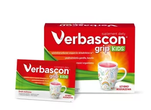 Co to jest Verbascon Grip Kids?Verbascon Grip Kids to suplement diety w postaci proszku do rozpuszczania o smaku malinowym. Produkt zalecany jest dla dzieci od 3 roku życia i dorosłych w celu łagodzenia objawów przeziębienia i wspomagania pracy układu odpornościowego. Kompozycja preparatu oparta jest o działanie składników pochodzenia naturalnego, takich jak kwiat bzu czarnego, kwiat dziewanny oraz korzeń pelargonii afrykańskiej. Zawiera substancje słodzące. Właściwości: