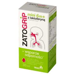 Produkt Zatogrip Mini 6m+ z laktoferyną, krople dla dzieci, 30 ml do kupienia w Gemini. Zatogrip Mini to podwójna siła dzięki połączeniu ekstraktów roślinnych z owoców czarnego bzu i owoców aceroli. Formuła suplementu ...