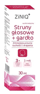 ZINIQ Struny głosowe + Gardło Spray wyrób medyczny dla osób dorosłych i dzieci powyżej 3. roku życia. Zmniejsza uczucie suchości i drapania w gardle.