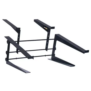 Stół posiada antypoślizgową gumową powierzchnię, aby zapewnić maksymalną stabilność urządzeń podczas pracy. Lekko kątowana platforma pod konsolę i platforma pod laptop posiadają indywidualną regulację wysokości i szerokości, aby zapewnić właściwe ustawienie sprzętu i podnieść ergonomię pracy. Pulpit może być przykręcony do blatu, case'a lub swobodnie stać na dowolnej powierzchni. To idealne rozwinięcie stanowiska pracy DJ Specyfikacja techniczna: Stelaż: metalowy, czarny Szer.