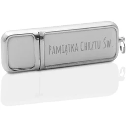 Biały pendrive skórzany z wygrawerowanym napisem: Pamiątka Chrztu Św.
