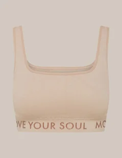 Stanik damski Fleen to wygodna bielizna w kawowym odcieniu. Jeśli szukasz sportowego biustonosza, który doskonale podtrzymuje biust, a jednocześnie doskonale układa się na ciele i pozostaje niewidoczny pod ubraniem, to model Fleen będzie strzałem w dziesiątkę. Szeroka guma z ozdobnym napisem Move your soul zapewnia optymalną stabilizację piersi w trakcie treningu, a prążkowana dzianina idealnie dopasowuje się do sylwetki. T-shirt bra