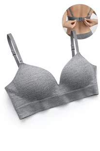 Biustonosz damski prążkowany Push Up bez fiszbin wygodny szary M/L ‼️ UWAGA: Na metce jest zaznaczony rozmiar L/XL, jednak rzeczywiste dopasowanie odpowiada rozmiarowi M/L ‼️ ➡️ Biustonosz damski Push Up bez fiszbin z prążkowanego materiału, zapinany z tyłu. Zapewnia wygodę noszenia i dobre dopasowanie, idealny do codziennego użytku.