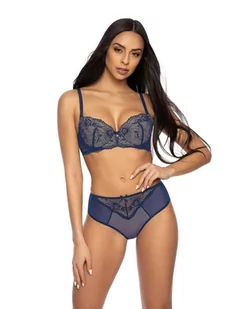 Biustonosz typu push-up, na fiszbinach. Dołączone, wyjmowane gąbeczki, miseczki obszyte koronką w granatowym kolorze. Ramiączka nieodpinane, regulowane. Skład: 27% bawełna, 26% poliamid, 21% poliester, 21% poliuretan, 5% elastan.