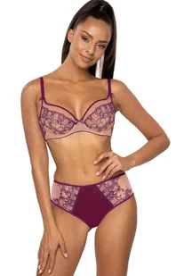 Biustonosz miękki beżowo-fioletowy Maureen M-3808/2 charakteryzuje się miseczkami z koronki z fiszbinami, które są podszyte delikatną bawełną od środka dla zapewnienia komfortu. Regulowane ramiączka są nieodpinane, a boki biustonosza wykonane z elastycznej siateczki pozbawione są bocznych fiszbin, co zwiększa wygodę. Biustonosz jest wyposażony w trzystopniowe zapięcie na dwie lub trzy haftki, umożliwiające idealne dopasowanie obwodu pod biustem.