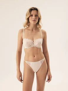 Esotiq biustonosz miękki soft koronkowy Bluey 42917-00X to kobiecy model o subtelnej konstrukcji, który łączy lekkość koronki z wyraźnie modelującą linią. Miseczki wykonane są z transparentnego tiulu pokrytego finezyjnym haftem o kwiatowym wzorze. Mają klasyczny, trzyczęściowy podział cięć, który dobrze podtrzymuje biust mimo braku usztywnienia. Dolna linia miseczek jest lekko pofalowana i wykończona koronką. Uwagę przyciąga niewielki, ażurowy łącznik między miseczkami, który eksponuje środek dekoltu w subtelny sposób. Tył stanika wykonano z miękkiej, półprzezroczystej siateczki, a ramiączka w tylnej części są wszyte w lekkim rozstawie V, co nadaje im delikatny wizualnie układ i poprawia stabilność konstrukcji.