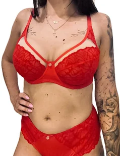 Biustonosz firmy Lilitte z kolekcji KAJA został zaprojektowany z myślą o kobietach, które chcą czuć się komfortowo i atrakcyjnie wyglądać, stanowi niezawodną dekoracje kobiecego ciała. Biustonosz przedstawiony na zdjęciu to niezwykle zmysłowy i efektowny model w intensywnym, ognistoczerwonym kolorze, który emanuje pewnością siebie, kobiecością i elegancją. Miseczki wykonane są z subtelnej, lekko prześwitującej koronki o roślinnym wzorze, która dodaje romantyzmu i lekkości. Trójdzielna konstrukcja miseczek z fiszbinami zapewnia świetne podtrzymanie i modelowanie biustu, podkreślając jego naturalny kształt. Dodatkowym atutem jest delikatny, dekoracyjny pasek biegnący tuż nad linią miseczek, który tworzy nowoczesny akcent i przyciąga wzrok w dekolcie.