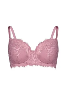 Biustonosz półusztywniany CLOE Esotiq | różowy Biustonosz półusztywniany CLOE w różowej tonacji to połączenie subtelnej estetyki z konstrukcją zaprojektowaną z myślą o stabilnym podtrzymaniu. Delikatna koronka o roślinnym motywie miękko układa się na miseczkach, tworząc elegancką, kobiecą linię dekoltu. Półtransparentna struktura materiału nadaje całości lekkości, jednocześnie podkreślając dopracowany charakter modelu. Półusztywniane miseczki z fiszbinami, osadzone na konstrukcji stworzonej z myślą o większych biustach, pomagają uporządkować kształt i zapewniają wyraźne, ale naturalne uniesienie. Starannie wyprofilowany mostek spina całość w harmonijną formę, a szerokie, koronkowe skrzydełka stabilnie otulają sylwetkę.