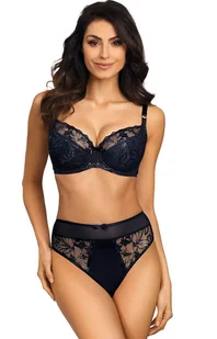 Biustonosz półusztywniany semi-soft granatowy Bonita B150 posiada fiszbiny dla dodatkowego wsparcia. Średniej wysokości mostek biustonosza zapewnia stabilność i równomierny rozkład ciężaru piersi. Miseczki wykonane z pianki, dają efekt delikatnego uniesienia i kształtu. Na piankę nałożony został haft w kwiatowy wzór, a następnie specjalna folia, która sprawia, że haft pięknie mieni się w świetle. Brak fiszbiny bocznej sprawia, że biustonosz jest jeszcze bardziej komfortowy i nie krępuje ruchów.