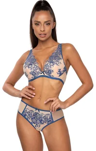 Frances seksowny biustonosz push-up beżowo-niebieski Frances M-3804/11/1 w niezwykle kobiecym stylu. Model w całości wykonany z pięknej, kwiecistej koronki w kolorze granatowym. Od środka miseczki posiadają podbicie koloru beżowego oraz kieszonkę na wkładki powiększające. Biustonosz naturalnie zbiera i unosi piersi. Ramiączka regulowane, nieodpinane.
