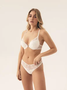 Biustonosz usztywniany Sydney Bloovii w kremowym odcieniu to propozycja dla kobiet ceniących elegancję i delikatne ozdoby. Model zdobi subtelna siateczka przeplatająca się z koronką w kwiatki, a zapięcie z przodu zapewnia wygodne i bezpieczne użytkowanie. To połączenie klasyki z nowoczesnym designem, które podkreśla naturalne piękno sylwetki. Wyjątkowy kształt trójkąta, utworzony przez misterną siateczkę i koronkę na plecach, nadaje biustonoszowi niepowtarzalnego charakteru. Ten detal nie tylko wzbogaca całość o nutę zmysłowości, ale również subtelnie modeluje sylwetkę, czyniąc go idealnym wyborem na każdą okazję.