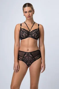 The Icon M – miękki, koronkowy biustonosz na drucie dla średnich i dużych biustów The Icon M to miękki, koronkowy biustonosz zaprojektowany z myślą o kobietach o średnim i dużym biuście, które oczekują solidnego podtrzymania bez rezygnacji z lekkości i elegancji. Konstrukcja oparta na fiszbinach skutecznie unosi i stabilizuje piersi, zapewniając ich naturalne ułożenie oraz harmonijny, zaokrąglony kształt. Miękkie miski dopasowują się do sylwetki, oferując wysoki komfort noszenia nawet przy pełniejszych kształtach. To model, który łączy funkcjonalność z estetyką – daje poczucie bezpieczeństwa, a jednocześnie podkreśla kobiecą formę w subtelny, nienachalny sposób. Koronka z kwiatowym motywem została zestawiona z delikatnymi tiulami i detalami o subtelnym, luksusowym wykończeniu, tworząc wyrafinowaną kompozycję faktur i lekki efekt wizualny.