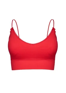 Biustonosz typu top Joy Bloovii | czerwony Minimalistyczny biustonosz typu top Joy Bloovii to połączenie wygody, kobiecego detalu i nowoczesnej formy. Wykonany z gładkiej, elastycznej dzianiny, doskonale dopasowuje się do sylwetki i zapewnia komfort noszenia przez cały dzień. Intensywny czerwony kolor dodaje energii i podkreśla charakter bielizny. Model wyróżnia się delikatnym dekoltem w kształcie litery V, który subtelnie akcentuje biust, nie rezygnując z naturalnego efektu. Cienkie, regulowane ramiączka pozwalają na indywidualne dopasowanie, a niewielkie satynowe kokardki z przodu wprowadzają lekko dziewczęcy akcent.