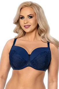 Elegancki biustonosz w granatowym kolorze. górna miseczek część wykonana jest z gładkiego materiałudolna część miseczek oraz mostek pokryte są haftemtył z gładkiej dzianinymiędzy miseczkami kokardkapionowe fiszbiny boczneramiączka regulowane, odpinane różnej szerokości dostosowanej do rozmiaruz tyłu zapięcie na haftkido kompletu polecamy figi VF-377Skład: 75% poliamid, 15% elastan, 5% poliester, 5% bawełna.
