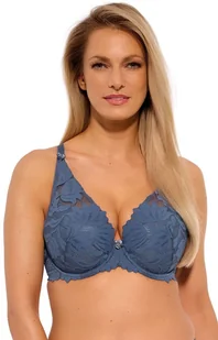 Gaia biustonosz push-up niebieski Sophia Art. 1225 to wyjątkowo kobiecy model o konstrukcji PU3, który doskonale podkreśla biust. Miseczki wykonano z delikatnej koronki i nierozciągliwego tiulu, a dolna ich część jest usztywniona, co zapewnia stabilne podtrzymanie i komfort. Wzór na tkaninie subtelnie zdobi biust, tworząc elegancki efekt na ciele. Biustonosz posiada wyciągane wkładki push-up, dzięki czemu można go szybko zmienić w model typu FullCup.