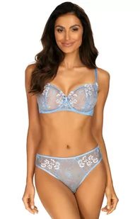 Stabilizator boczny wszyty pod taśmę, tak by był jak najmniej wyczuwalny, ale jednocześnie pełnił swą funkcję. Boczki elastyczne wzmocnione siateczką. Ramiączka ozdobne, regulowane, nie odpinane. Zapięcie na dwie haftki, trójstopniow