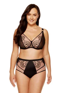 Prześwitujące, wyciągnięte ku górze, miękkie miseczki z podwójnej siateczki i haftu,Plecy wykonane ze wzmocnionego tiulu elastycznego,Złote detale dodają szczypty elegancji,Pionowe fiszbiny boczne stabilizują obwód biustonosza,Biu