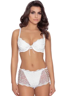 Zalotna, pełna dziewczęcego uroku Sophie N 01 uwodzi bezpretensjonalnym wdziękiem i czaruje kunsztem wykonania. Klasyczna forma biustonosza push-up w całości otulona została finezyjnie haftowanym granatowym tiulem, co dodaje mu lekkości i zwiewności. Efekt ten potęguje wychodzący poza ramy biustonosza haft, tworzący kokieteryjne falbanki spięte u zbiegu misek designerską kokardką ze złotą klamrą. Same miseczki wyścielone zostały zaś miękką pianką pokrytą bawełną, co sprawia, że piersi znacznie się unoszą i apetycznie zaokrąglają, a komfort użytkowania wzrasta do maksimum.