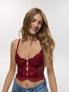 Biustonosz o formie gorsetu, wykonany z koronki.