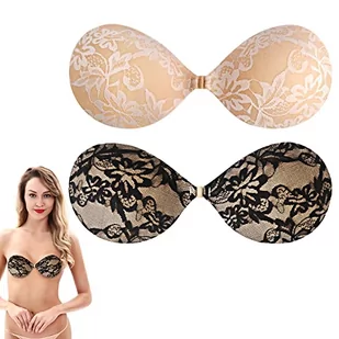Voxshe 2 sztuki samoprzylepnych biustonoszy, bez ramiączek, koronkowy biustonosz wielokrotnego użytku, samoprzylepny, niewidoczny biustonosz do sukni wieczorowej bez pleców, czarny + nude, B