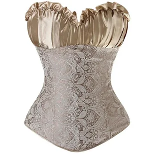 CECHY PRODUKTU Damski gorset Wykonany z satynowego materiału W eleganckie wzory Z wiązaniem Zapięcie na zamek po boku Dostępny w pięciu kolorach: czarny, szary, beżowy, czerwony i biały