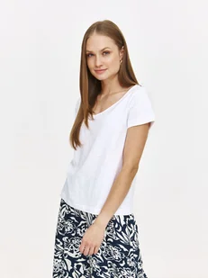 Top damski dostępny w kolorze białym TSKS25TOP302800X00. Modelka ma 177 cm wzrostu i prezentuje rozmiar 34.