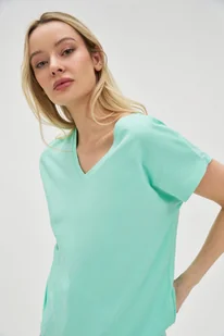100% BAWEŁNABluzka damska w odcieniu mięty wyróżnia się gładką powierzchnią i modnym krojem z krótkimi rękawami, który zapewnia pełną swobodę ruchów nawet w najcieplejsze dni. Dekolt w serek subtelnie podkreśla linię szyi, a luźny fason gwarantuje wygodę i lekkość przez cały dzień. Naturalna bawełna sprawia, że materiał jest przewiewny, miękki i przyjazny dla skóry. Idealny wybór na letnie spacery, codzienne wyjścia czy nieformalne spotkania ze znajomymi. Doskonale komponuje się zarówno z jeansowymi szortami, lnianymi spodniami, jak i klasyczną spódnicą midi.
