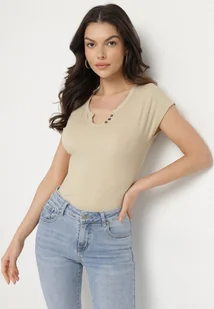 Beżowy T-shirt o Dopasowanym Kroju z Wycięciem i Guzikami przy Dekolcie Ballirea