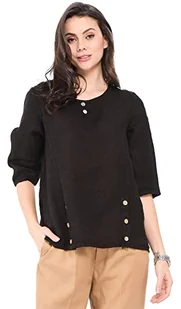 Bonateks damska top 100% lniana tunika Made in Italy, okrągły dekolt z guzikami i półrękawami, czarna, rozmiar: M, czarny, M