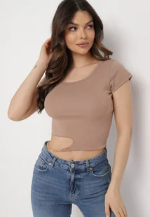 Ciemnobeżowy Bawełniany T-shirt z Asymetrycznym Wycięciem i Ozdobnym Łańcuszkiem Glitia