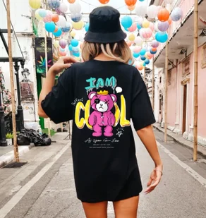 Obniżona linia ramion dodaje streetwearowego charakteru, a szerokie rękawy i wydłużony tył sprawiają, że koszulka świetnie prezentuje się zarówno wpuszczona w spodnie, jak i noszona na luzie. DesignKoszulka wyróżnia się efektownym nadrukiem na plecach, który nadaje jej unikalny wygląd. W zależności od wzoru może być minimalistyczna i subtelna lub bardziej wyrazista – idealna dla kobiet, które lubią wyróżniać się w tłumie. Czysta czerń materiału sprawia, że nadruk jest dobrze widoczny, a całość prezentuje się nowocześnie i stylowo. StylizacjeDzięki uniwersalnej kolorystyce i prostemu, ale wyrazistemu fasonowi, koszulka pasuje do wielu stylizacji.
