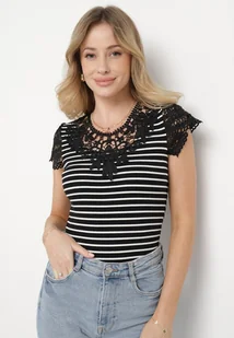 Czarny Bawełniany T-shirt z Prążkowanego Materiału z Koronkowym Dekoltem i Rękawkami Hyacintia