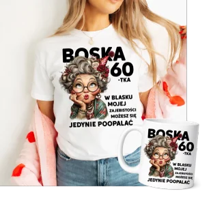 Zestaw prezentowy na 60 urodziny dla kobiety – koszulka i kubek Szukasz oryginalnego pomysłu na prezent na 60 urodziny dla kobiety? Ten stylowy zestaw urodzinowy z koszulką i kubkiem to idealny wybór dla mamy, siostry, przyjaciółki, żony lub koleżanki z pracy. Modny design, kobiecy motyw kwiatowy oraz humorystyczny napis sprawiają, że to upominek, który wywoła uśmiech i podkreśli wyjątkowość jubilatki. Dlaczego ten zestaw to idealny prezent na 60-tkę? ✔ Gotowy zestaw prezentowy na 60 urodziny – koszulka + kubek w spójnym, eleganckim stylu ✔ Humorystyczny i pozytywny przekaz – podkreśla pewność siebie i dojrzałe piękno ✔ Uniwersalny pomysł na prezent dla kobiety po 60 ✔ Idealny na imprezę urodzinową, sesję zdjęciową i jako pamiątka na lata Koszulka na 60 urodziny dla kobiety Biała koszulka z efektownym napisem to świetny wybór na urodzinową stylizację. Duża, wyrazista liczba „60” przyciąga uwagę, a subtelne kwiaty dodają całości delikatności i kobiecego charakteru. Koszulka sprawdzi się zarówno podczas przyjęcia, jak i na co dzień – jako zabawne przypomnienie o pięknym jubileuszu.
